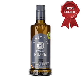 Маслиновото масло ARBEQUINA, от CASAS DE HUALDO е хармонично, ароматно и деликатно. Сребристият цвят на етикета му говори за неговата елегантност и финес. Пълен с аромати, той предизвиква усещане за артишок, трева и домати, поражда хармонично и ароматно цяло. Маслината е мека, сладка и фина Arbequina. Зехтинът е създаден чрез студено извличане в рамките на 6 часа след прибиране на реколтата, за да се осигури висока хранителна и сензорна стойност. Подходящ за всички видове ползване, екологично чист натурален продукт, без примеси, оцветители и ГМО. Подходящ за вегани.